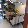 - Mesa com seis cadeiras e madeira maciça e tampo de vidro.