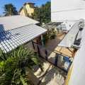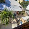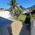 - Quintal grande com chuveiro de alta pressão, três coqueiros e uma palmeira azul.