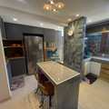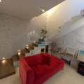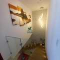 - escada com 3 nichos, iluminação de Led embutida, corrimão de vidro, e revestimento 3D na parede.