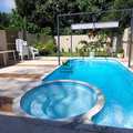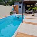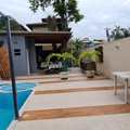 Área gourmet, chuveiro externo, lavabo, piscina com hidromassagem e jardim.